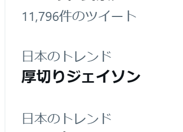 まことお兄さんやはるちゃんうーたんを差し置いて厚切りジェイソンがトレンドにでるのはEテレ視聴勢だいたい垂れ流し視聴の証明かもですねぇ。