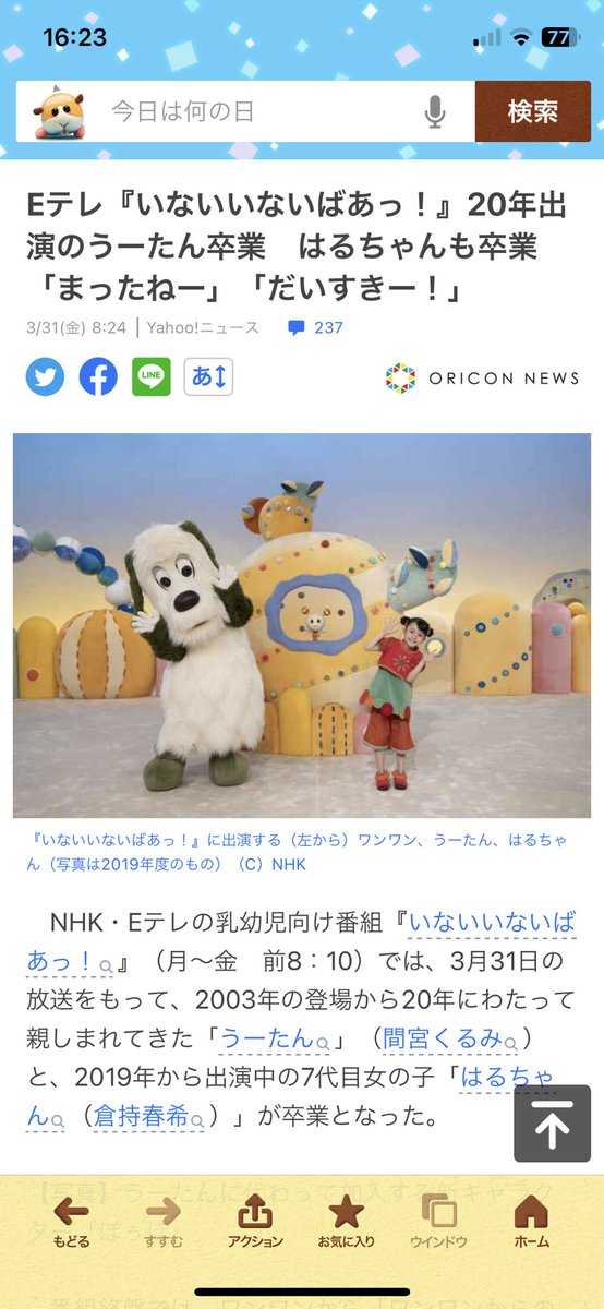 うーたんが卒業!?はるちゃんはそろそろかなぁと思ってたけど、うーたんは完全盲点😭 ワンワンがコンサートで、歴代の子達をみて「みんな大きくなったねー」と言うのを、ぐっと胸をつまらせながら見てたけど、もしワンワン卒業ってなったら号泣してしまうかも。ご自愛ください🙇♀️