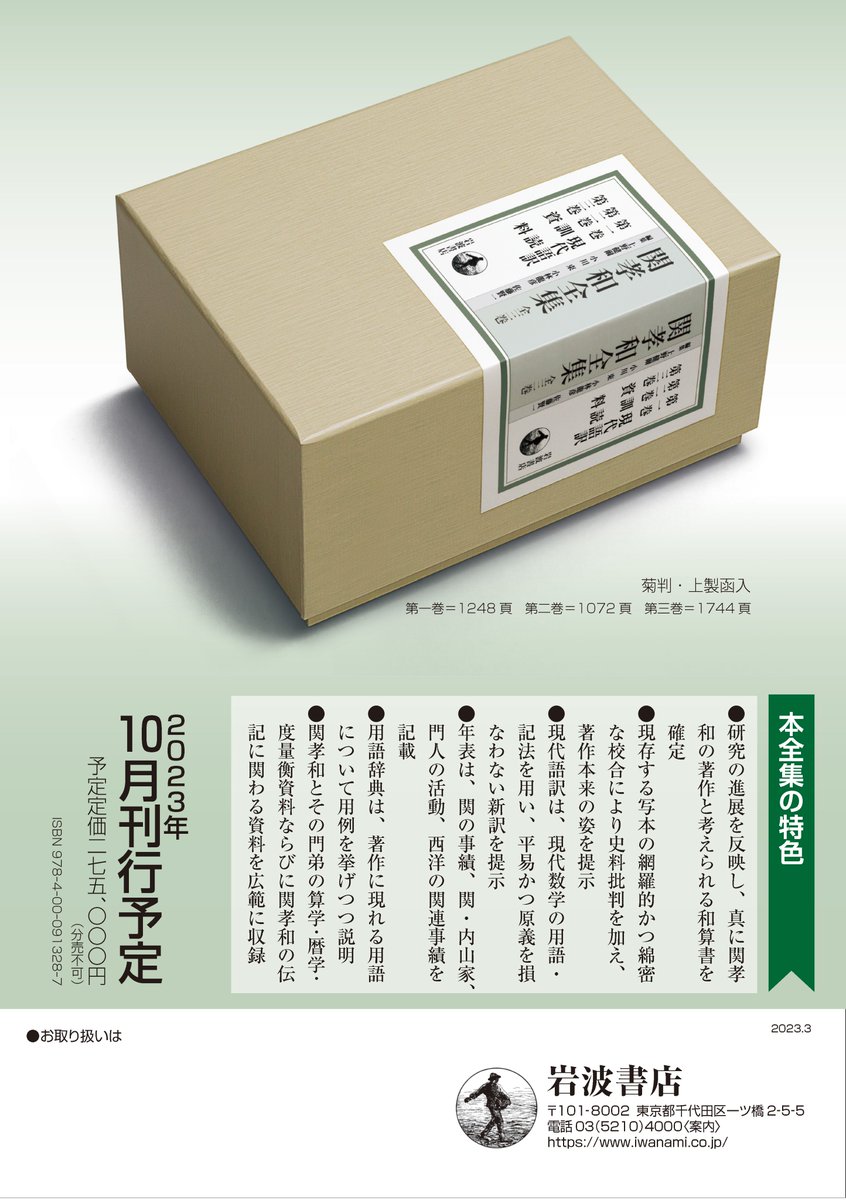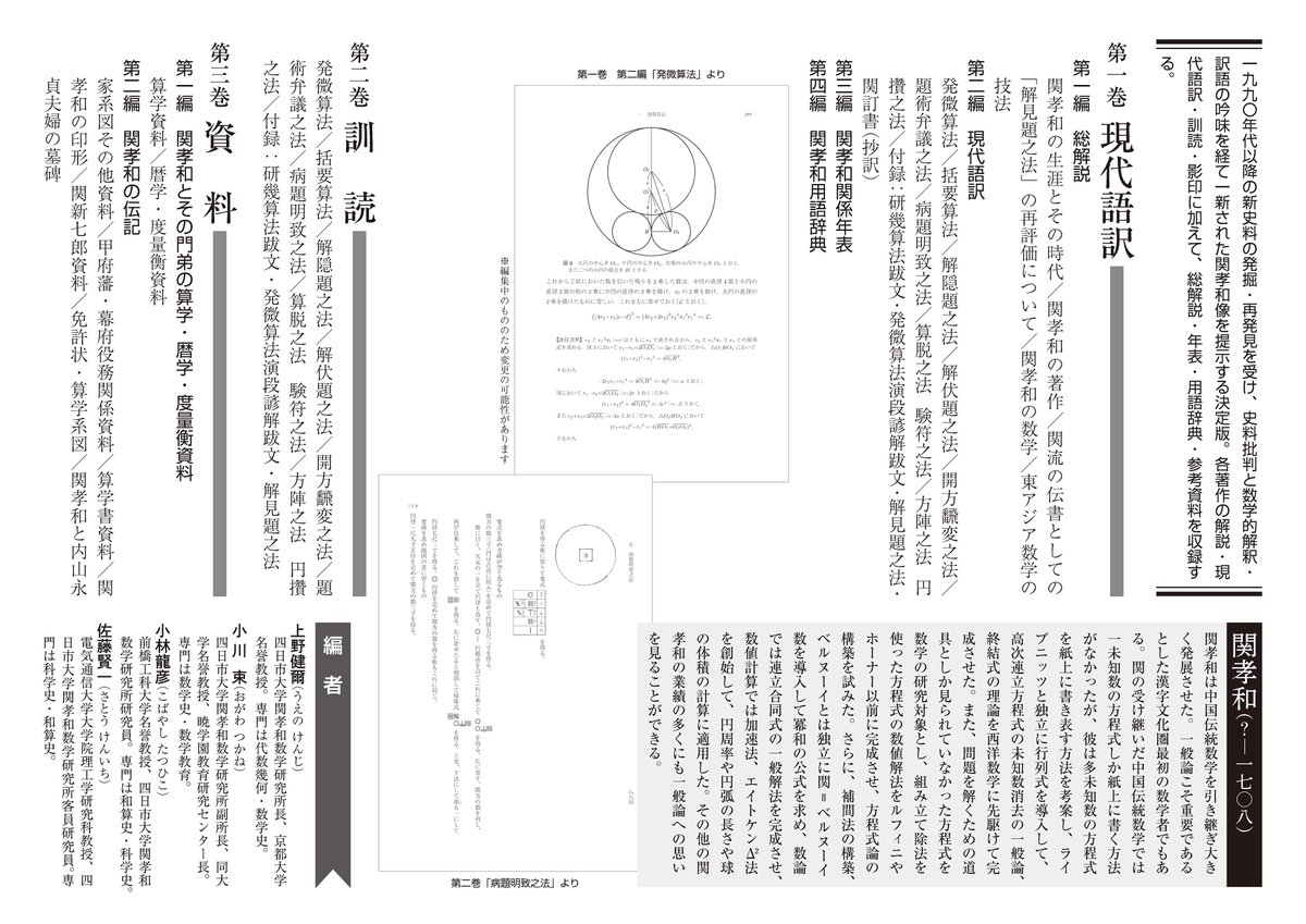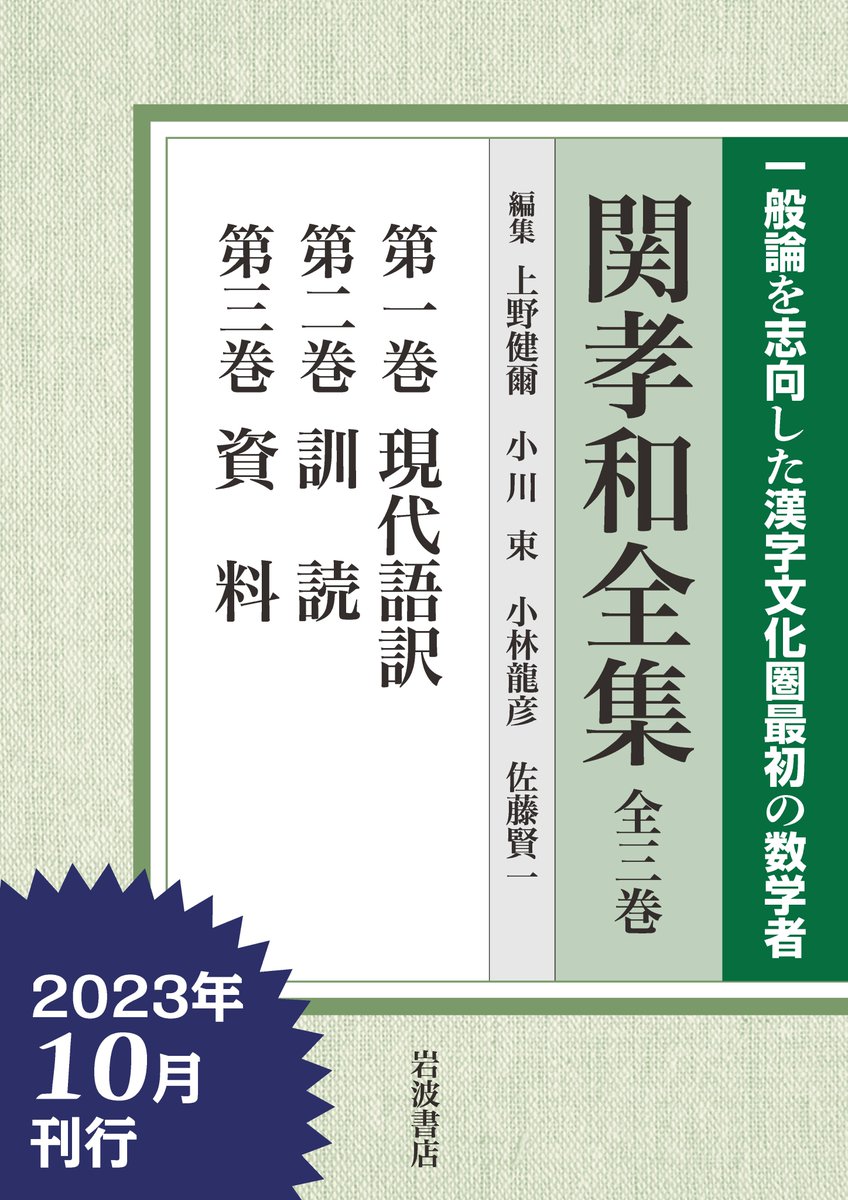 【刊行予告】1990年代以降の新史料の発掘・再発見を受け、史料批判と数学的解釈・訳語の吟味を経て一新された関孝和像を提示する決定版。 上野健爾・小川束・小林龍彦・佐藤賢一 編集 『関孝和全集』(全三巻) 2023年10月刊行予定 予定定価275,000円 (エイプリルフールネタではありません)