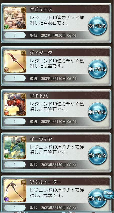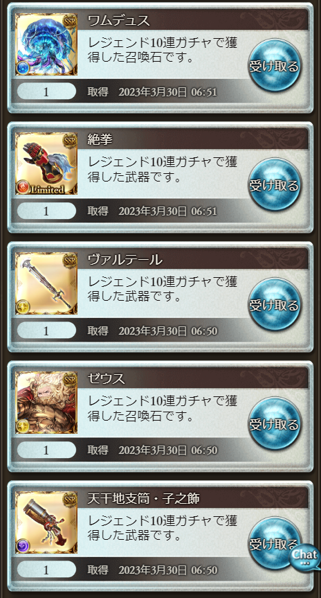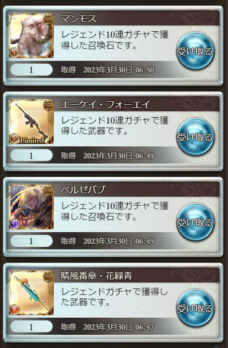 んー、、、、 100連+スーパームック40連(7個)で結果13個 しっかし1月にシェロチケしたバブやら、1末にサプチケしたゼウスなりが良く来る…;; 最後の傘はおはガチャ分ですね、、、