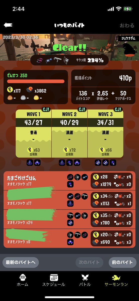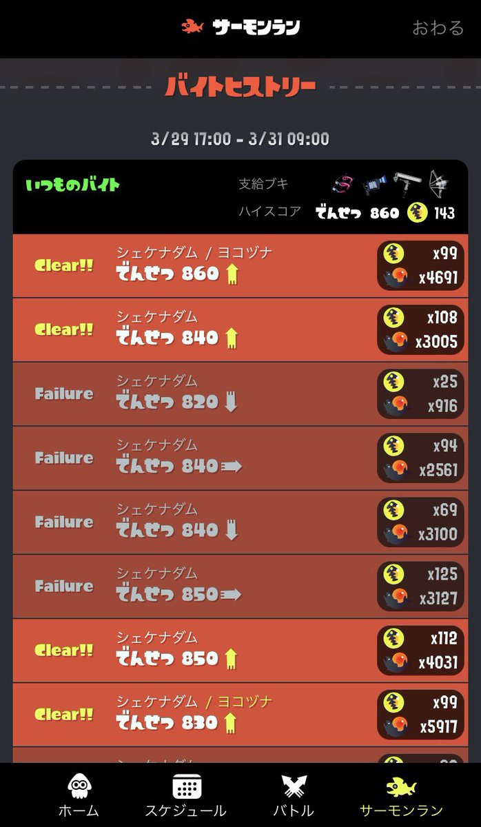 シェケナダムは頭がおかしい。 下手したら……いや、多分普通にドンブラコよりエグい気がする。 これを改修無しで3に持ってこようと決めたスタッフは、是非是非ダイナモ有りで野良カンストやってみてもろて。 とりあえず今日はここまで。しっかり休んでまた明日挑もう……