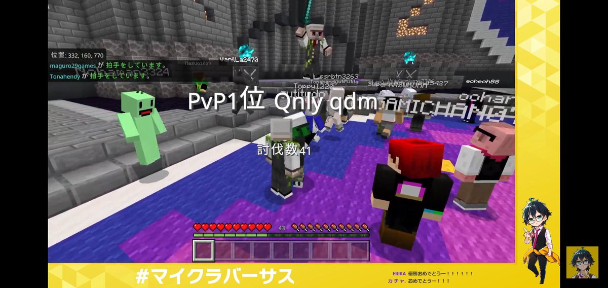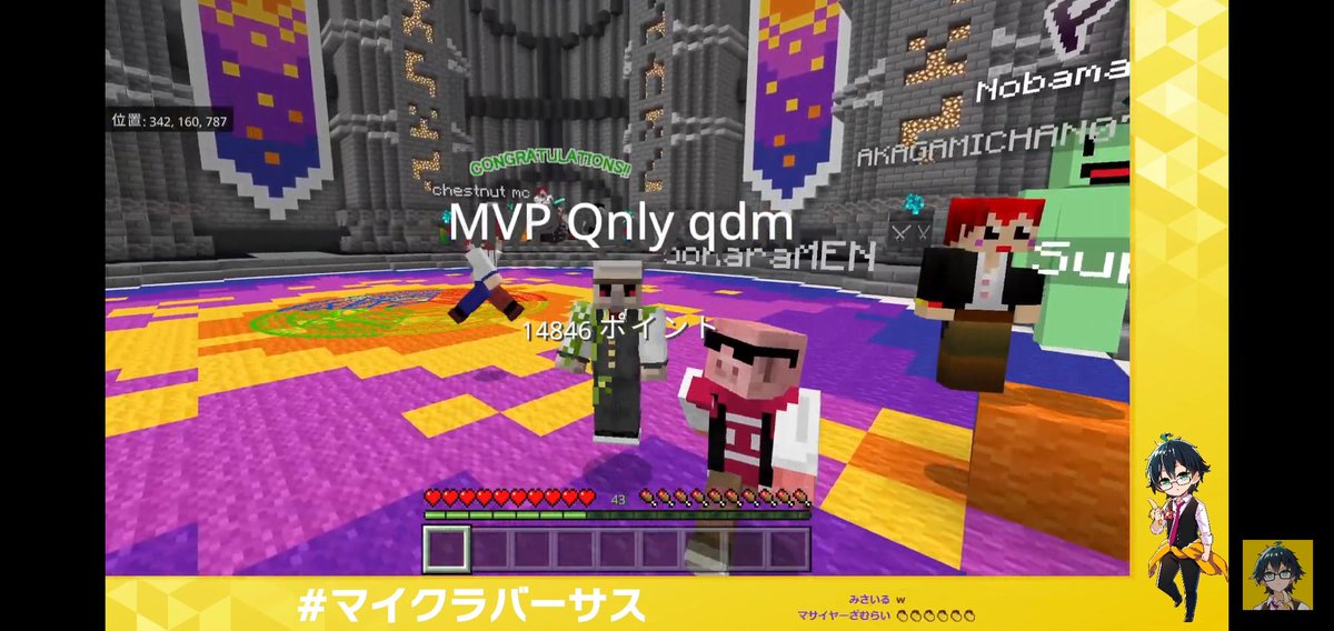 マイクラバーサス出場者のみなさん、MCのマスオTVさん、運営さんお疲れ様でした!! ぺこちゃん視点メインで応援してたけど、ホロライブとアツクラチームの絡みもあってめちゃくちゃたのしかったし嬉しかった🤍 残業で全部は見れてないから、アーカイブと別視点で楽しませてもらいます!!
