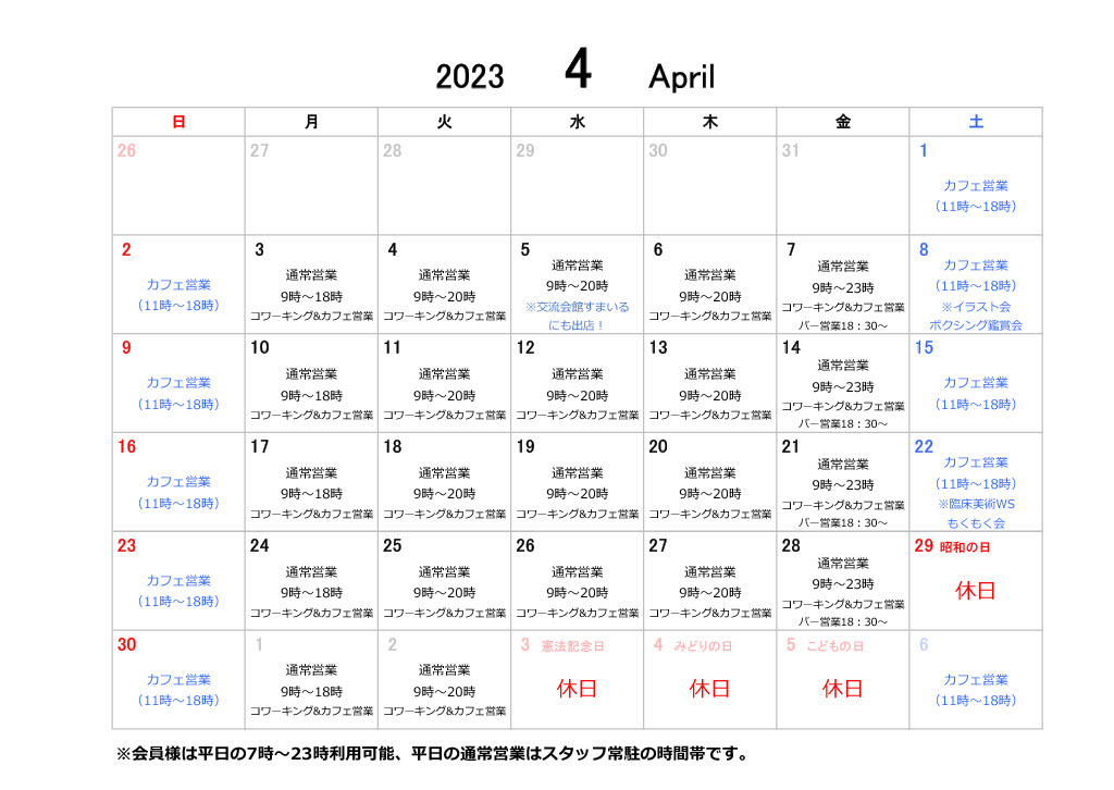 2023年4月のスケジュール 4月の営業等のお知らせです。 ~イベント~ 8日(土) 10時~:Flatこども クラブイラスト会 15時~:那須川天心ボクシングデビュー戦 ボクシング鑑賞会 22日(土) 10時~: 臨床美術WS 14時30分~:もくもく会 ~お休み~ 3/29(土・祝)お休み