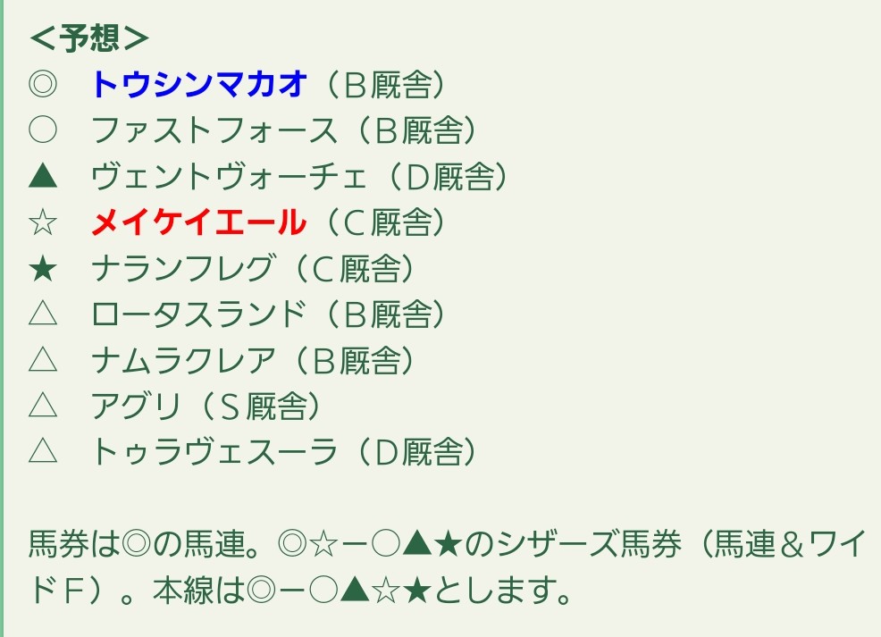 事前◎候補 メイケイエール ピクシーナイト ヴェントヴォーチェ トウシンマカオ ナムラクレア 単勝多点で的中率担保だと合成足りず、的中落として馬連F高めに切り替え。