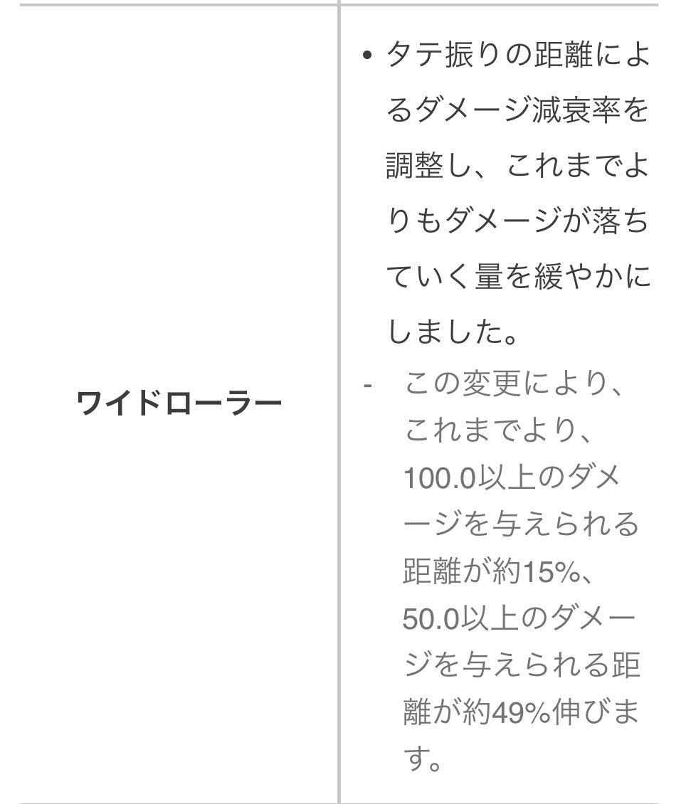 ワイドローラーこれかなり強化じゃない? 縦振りでキルしやすくなるなら全然話が変わって来るよ ラクトも使いやすくなりそうで楽しみだ スペシはヒト速強化でだいぶ差別化されるんじゃない? ヒト速を信じる者は救われる