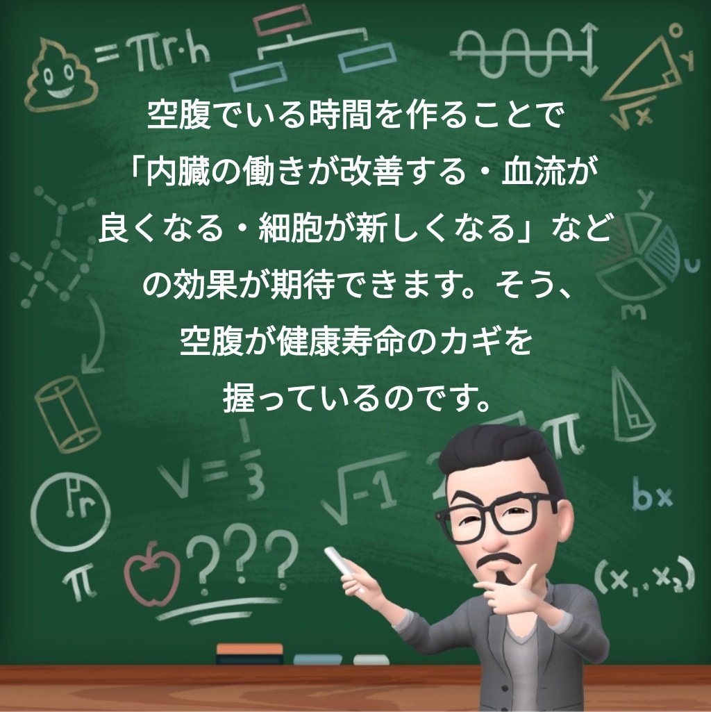 空腹でいる時間を作ることで「内臓の働きが改善する・血流が良くなる・細胞が新しくなる」などの効果が期待できます。 そう、空腹が健康寿命のカギを握っているのです。