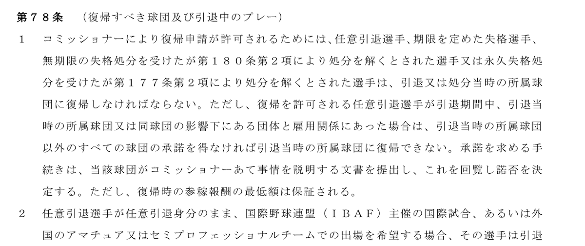 制限選手の説明を見ると、78条1項の復帰条件を付して制限選手として公示されると書いてあるが、78条1項を見てみると、制限選手に関する言及が全くない。 これはどう理解すれば良いのか?